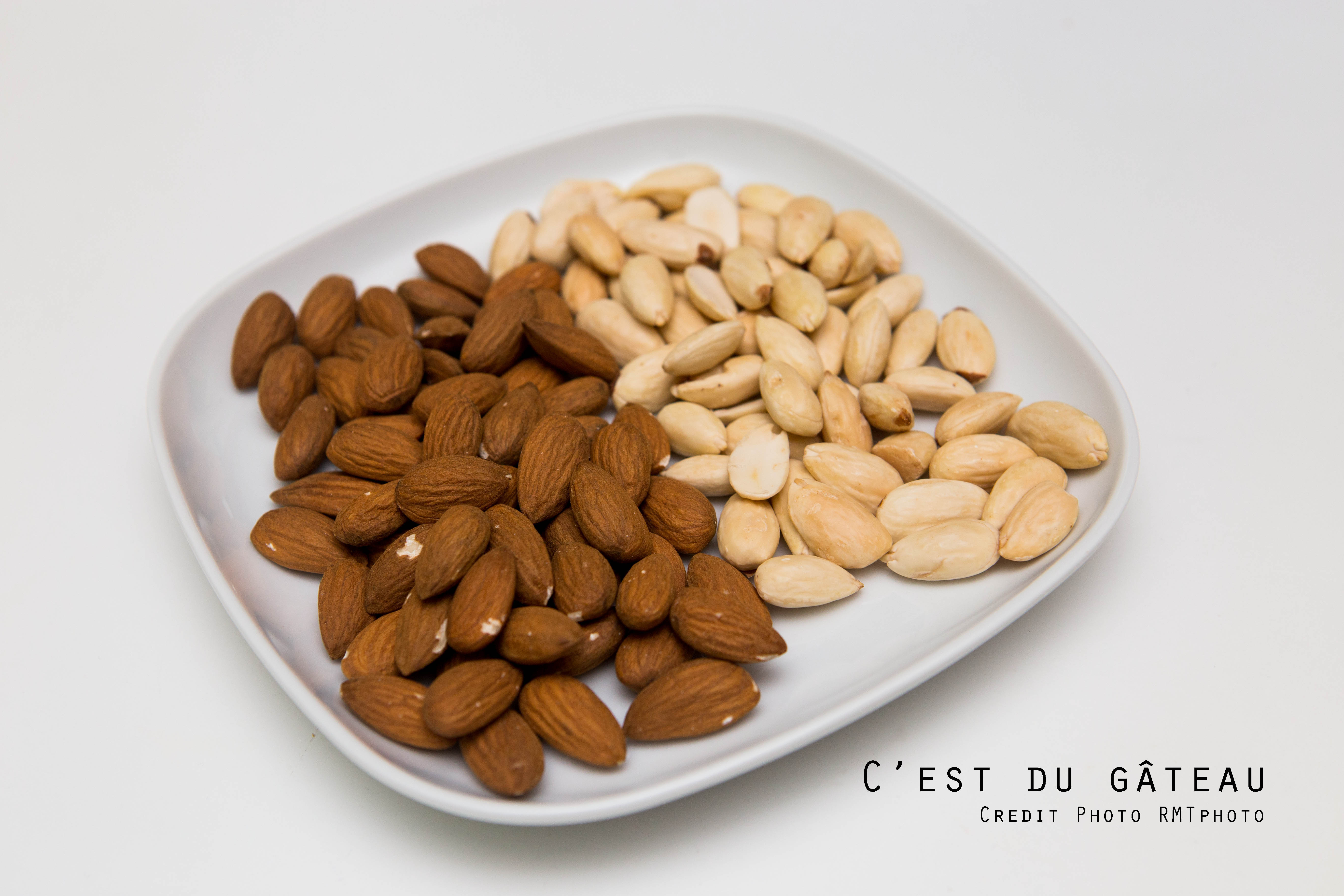 À gauche, les amandes avec leur peau. À droite, les amandes émondées
