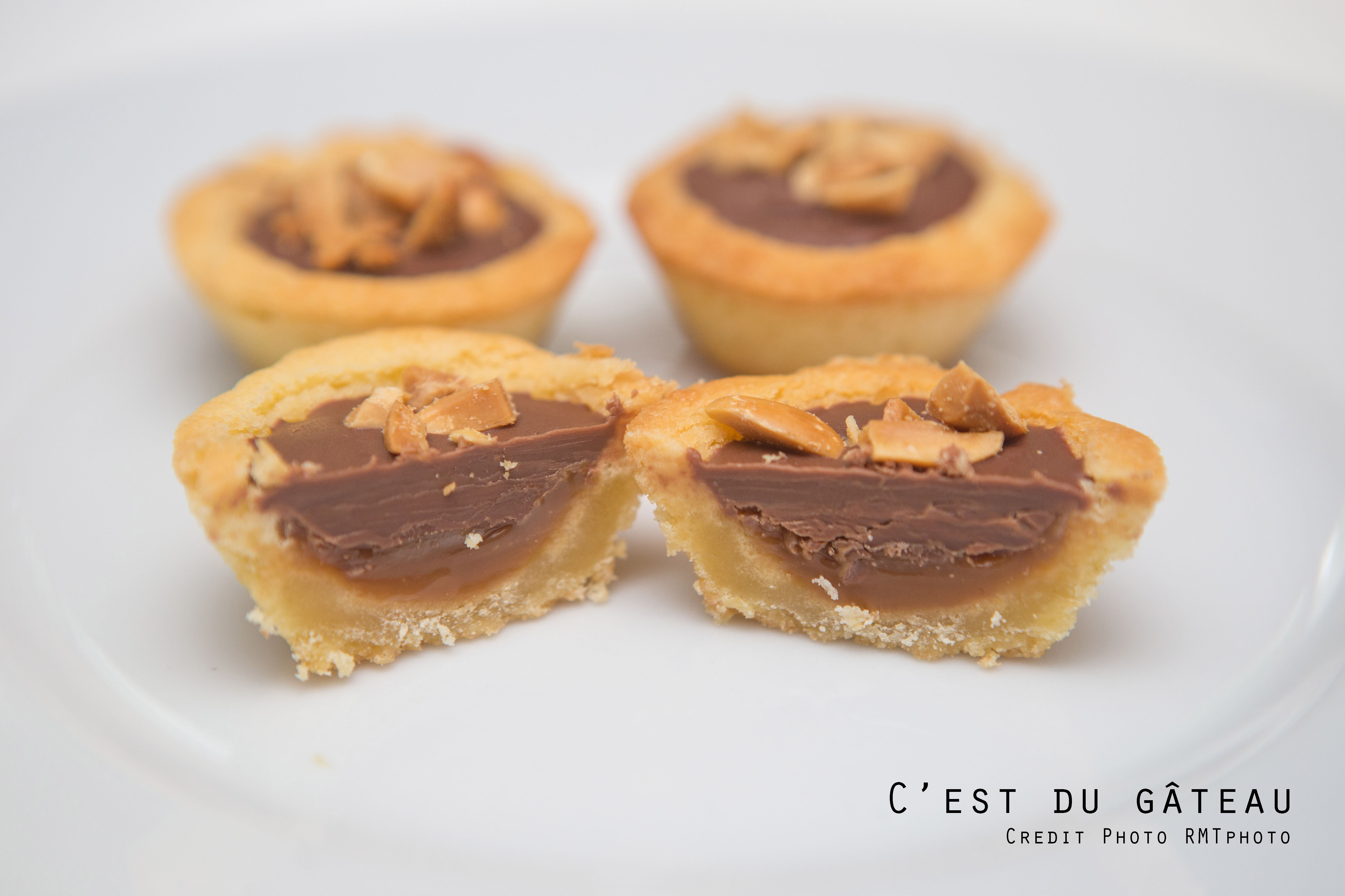 Voici une recette de mignardises absolument décadentes : des tartelettes de pâte sablée garnies de caramel et de chocolat au lait et parsemées de fruits secs. Parfaites pour un café gourmand ! Il s’agit d’une création de Christophe Michalak. Je ne sais pas d’où vient la recette originale, j’ai utilisé celle du blog C’est ma fournée.