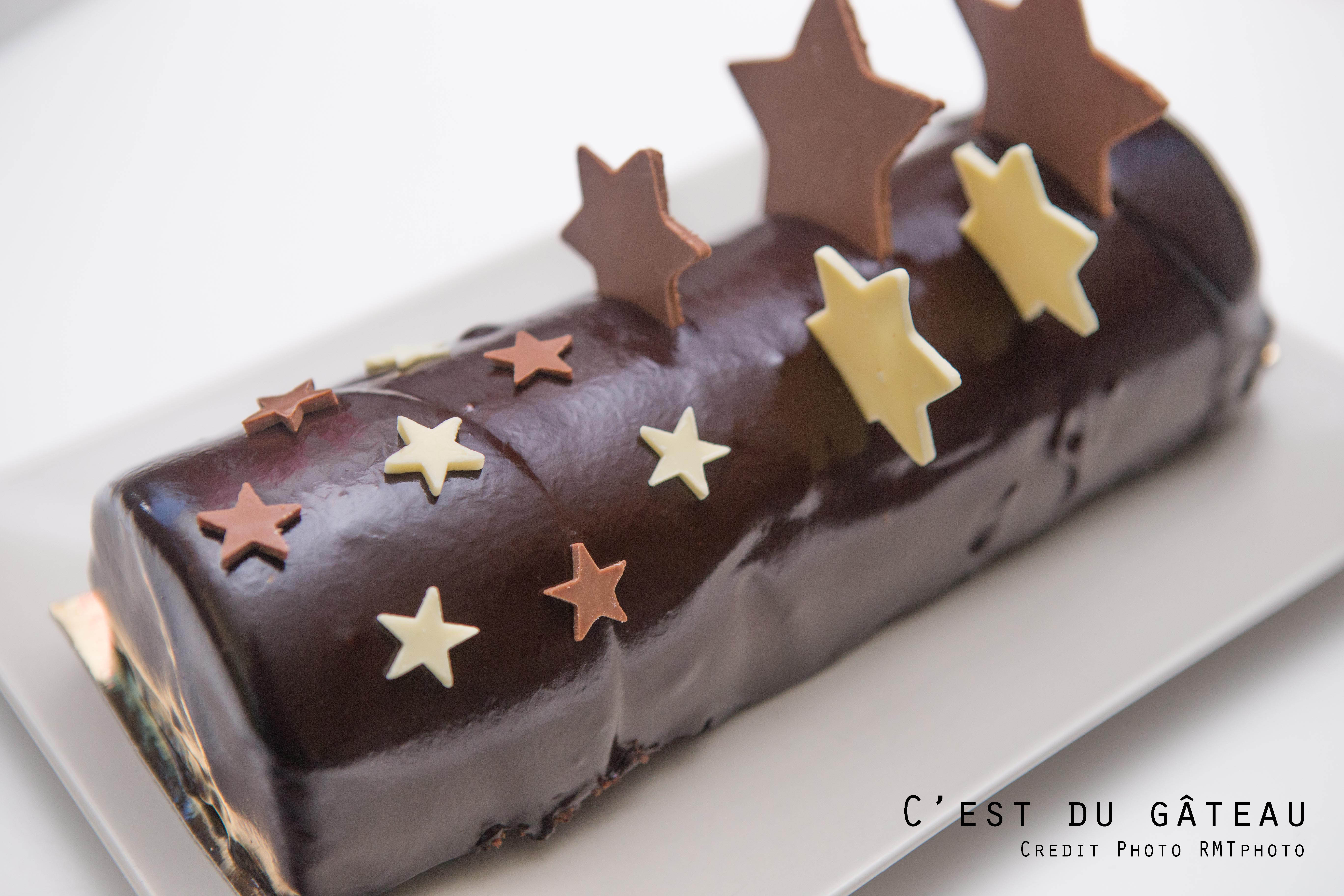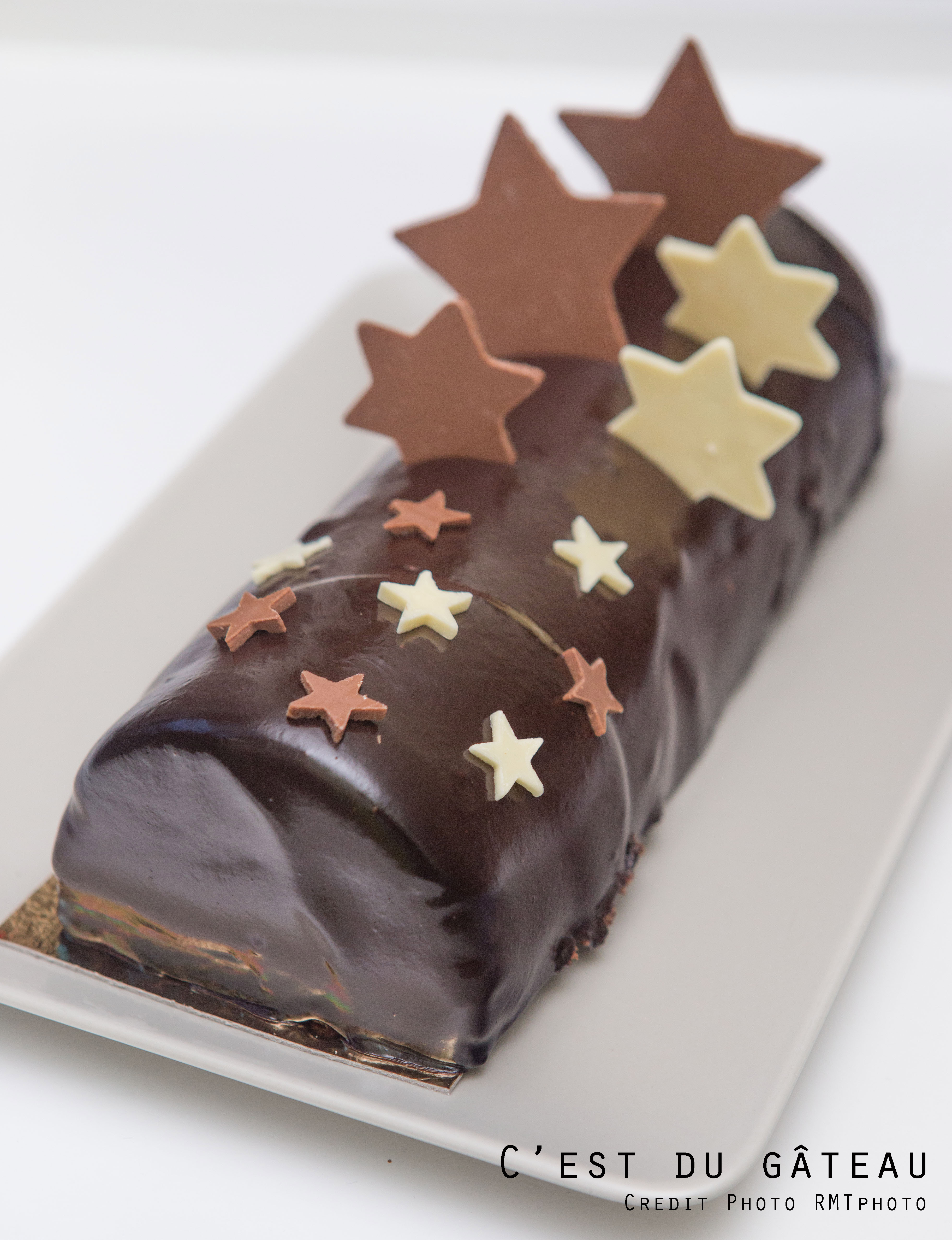 Aujourd’hui, je vous montre la plus simple à faire. Je l’ai recouverte d’un glaçage au chocolat noir et décorée avec des étoiles au chocolat blanc et au chocolat au lait. L’avantage de cette recette, c’est que vous pouvez étaler sa préparation sur plusieurs jours (comme pour l’entremets). Il faudra prévoir environ 6 heures pour la décongélation.