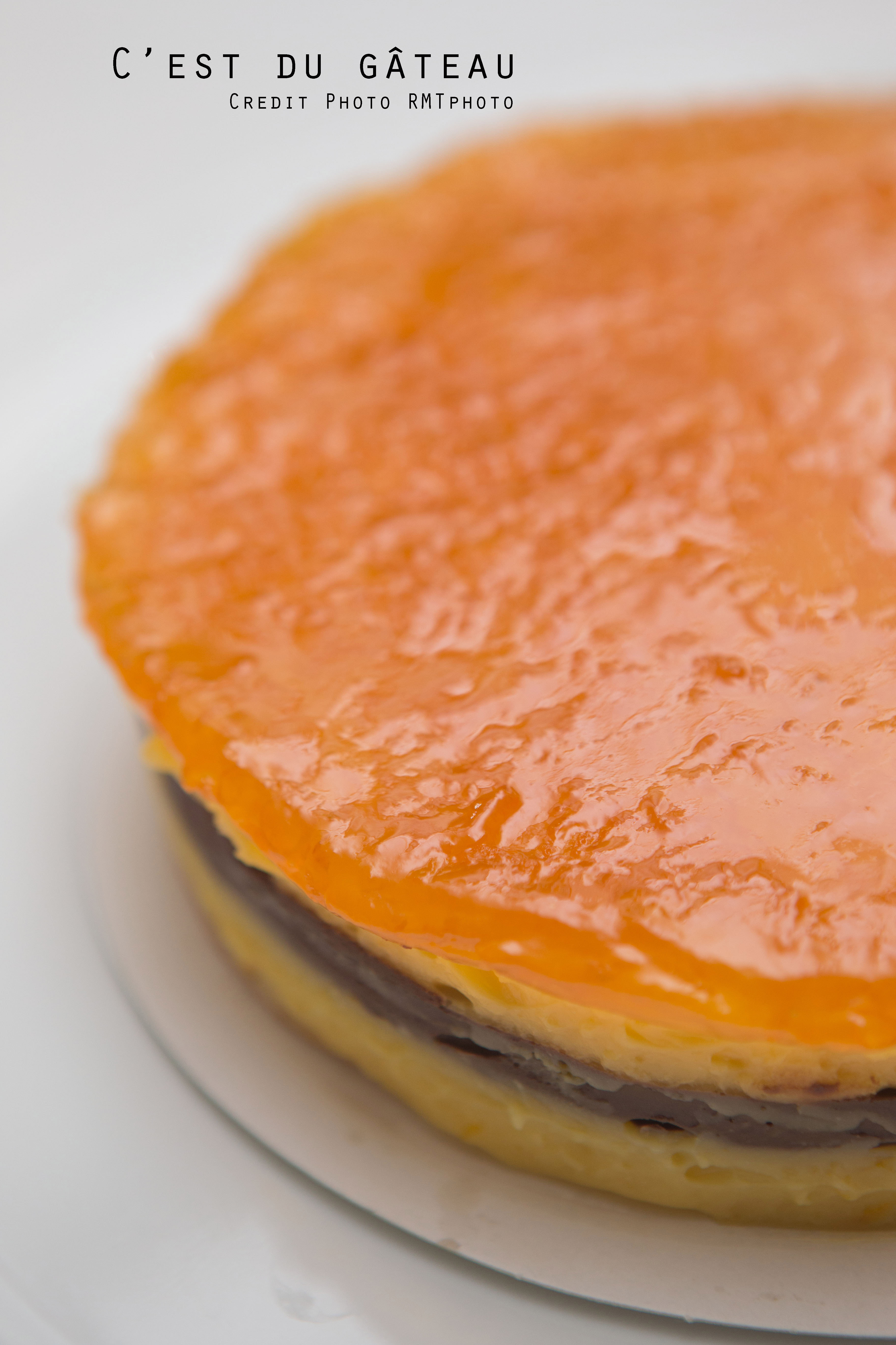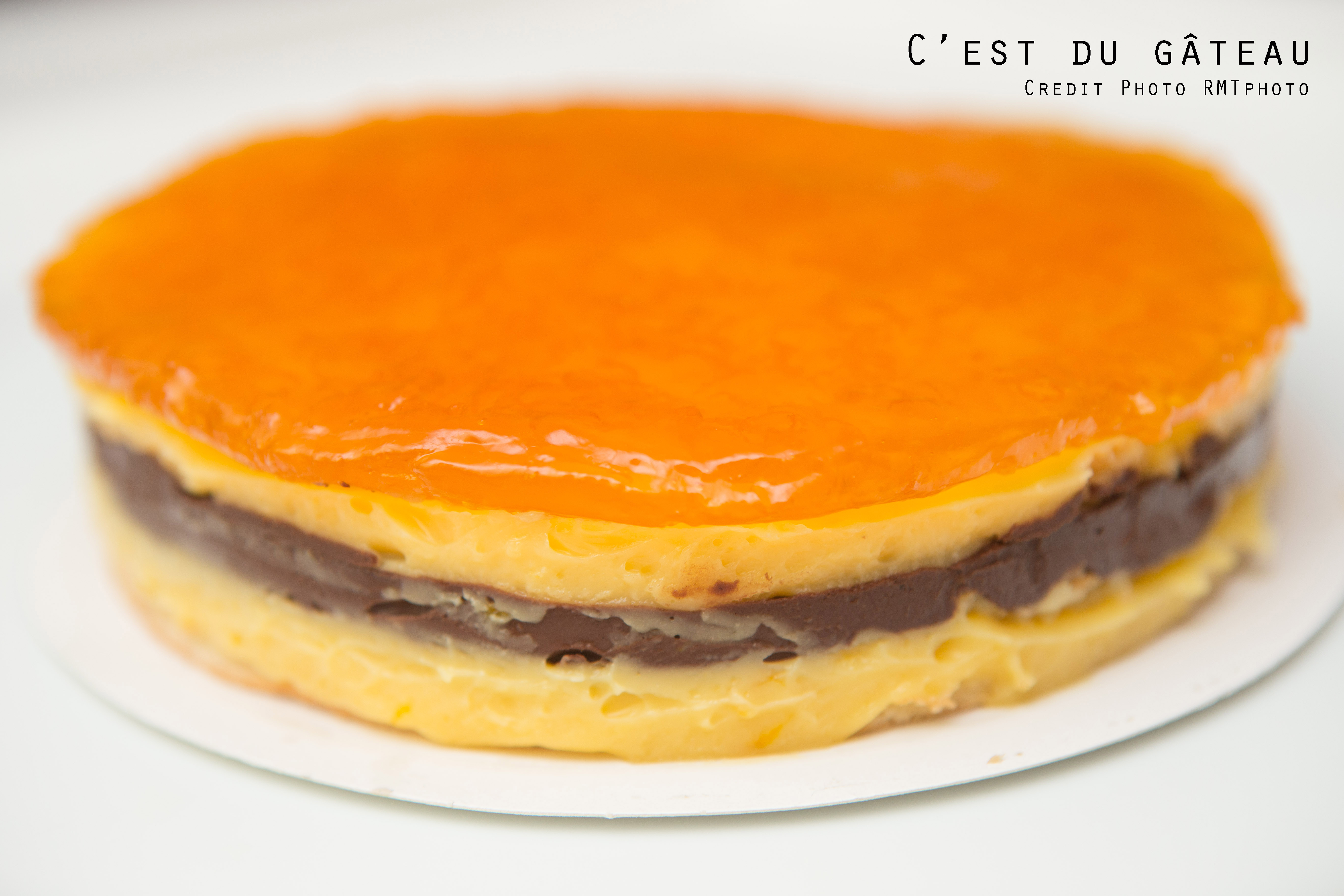 Mon opéra est donc composé d’un biscuit Joconde imbibé d’un sirop au Grand Marnier, de deux couches de crème à l’orange, d’une couche de ganache au chocolat noir, aux zestes d’orange, à la fleur de sel et au Grand Marnier, et d’un confit aux zestes d’orange légèrement gélifié.