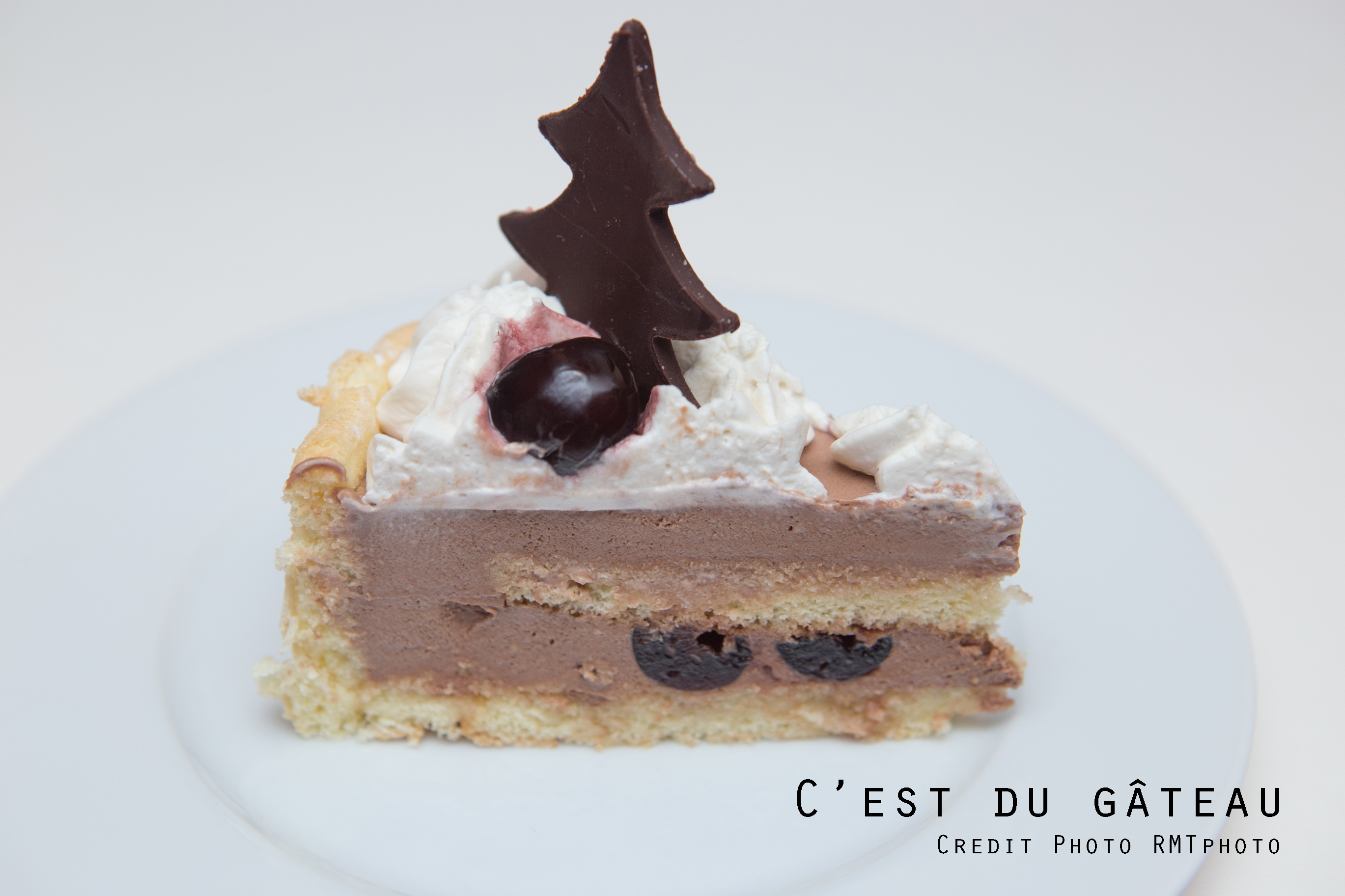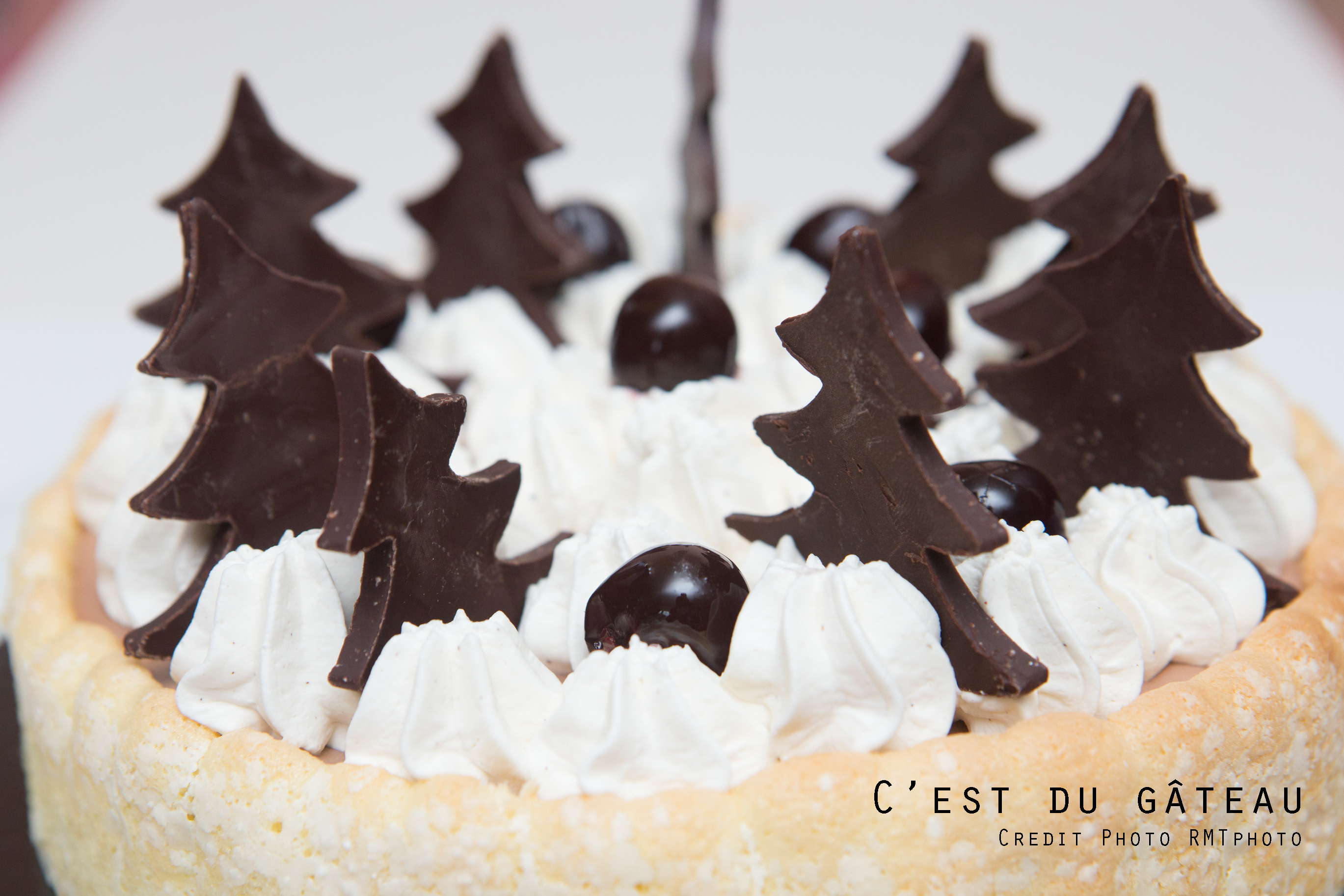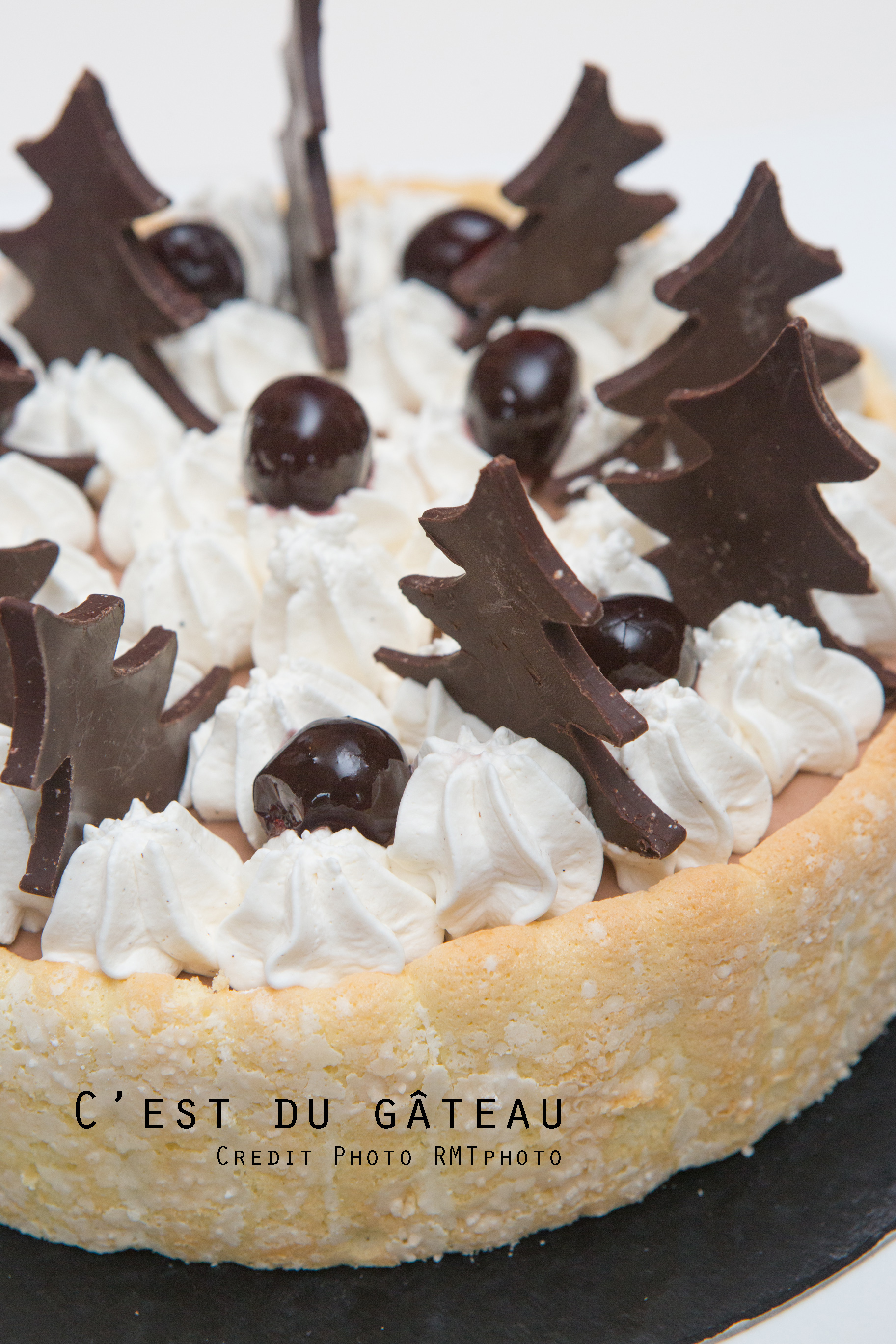 Cette charlotte est composée d’un biscuit à la cuillère maison, d’une bavaroise au chocolat, de cerises amarena, et décorée avec de la chantilly à la vanille, des sapins en chocolat et quelques cerises. Je n’avais jamais fait de bavaroise et celle-ci m’a beaucoup plu ! Elle n’est pas trop sucrée car j’ai utilisé du chocolat à 70 % de cacao – si vous utilisez un chocolat avec un teneur moindre en cacao, retirez un peu de sucre (je dirais 15 g). C’était très bon ; personnellement, j’adore l’association de la cerise et du chocolat.