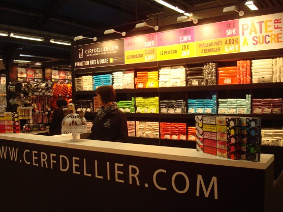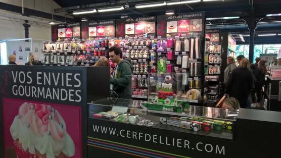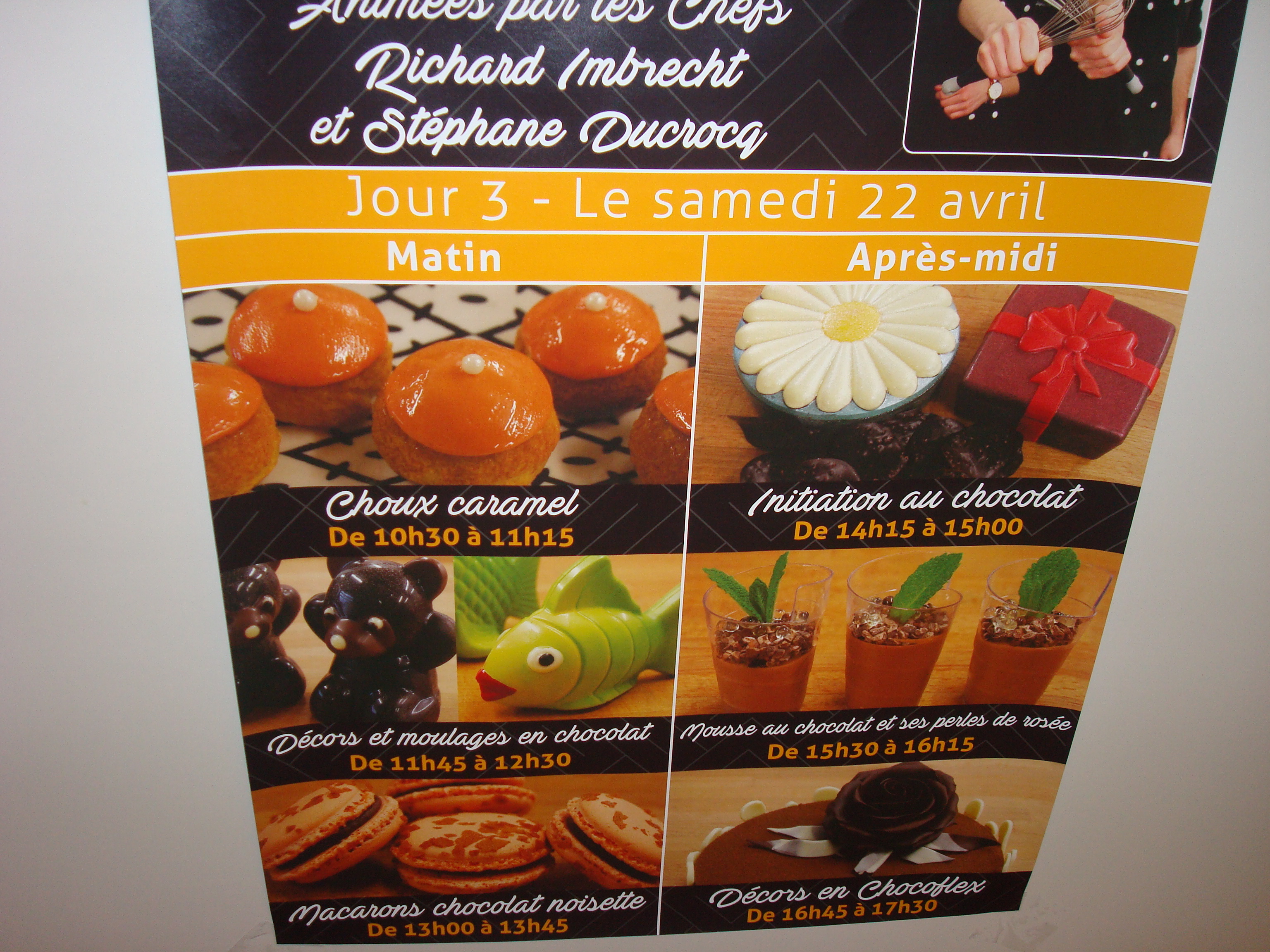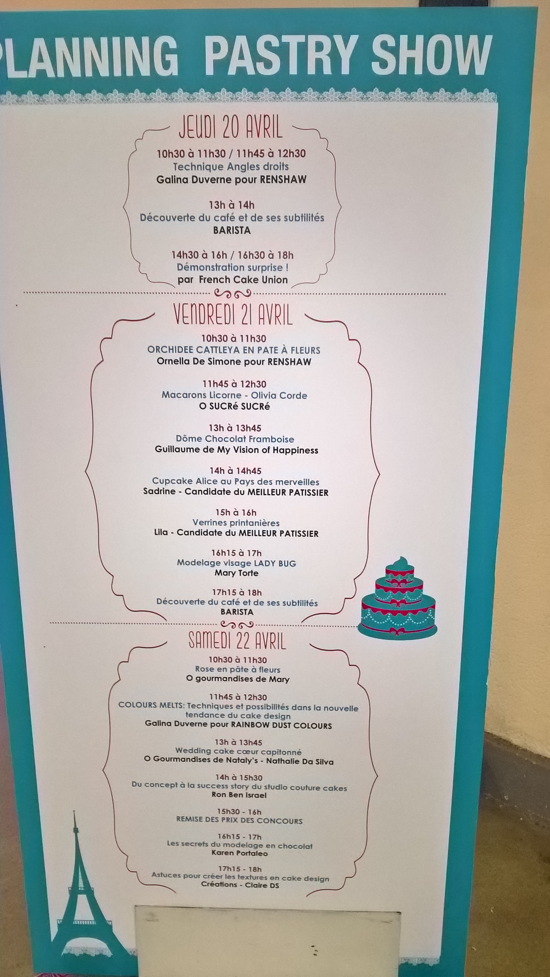 Enfin, vous pourrez acheter du matériel de pâtisserie, de la pâte à sucre, des colorants, etc. à la mini-boutique Cerf Dellier. Juste à côté, vous pourrez également assister à l’une des nombreuses démonstrations organisées pendant le salon : travail du chocolat, choux caramel et macarons. Je vous mets les horaires des démonstrations de samedi (cliquez sur la photo pour l’agrandir).
