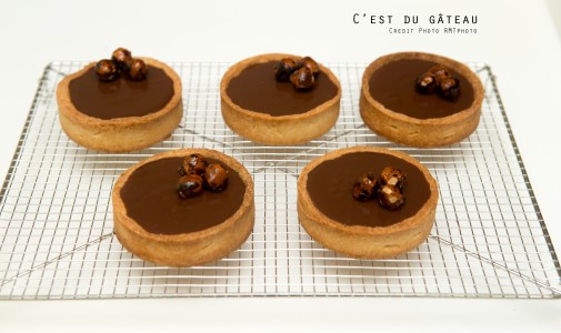 Voici un dessert très gourmand mais simple à réaliser : des tartelettes au Gianduja. Le Gianduja, c’est un mélange de chocolat au lait et de noisettes que vous pouvez faire vous-même ou acheter dans des boutiques spécialisées, chez un chocolatier ou sur Internet. Pour la décoration, j’ai caramélisé des noisettes. Qu’est-ce que c’était bon !
