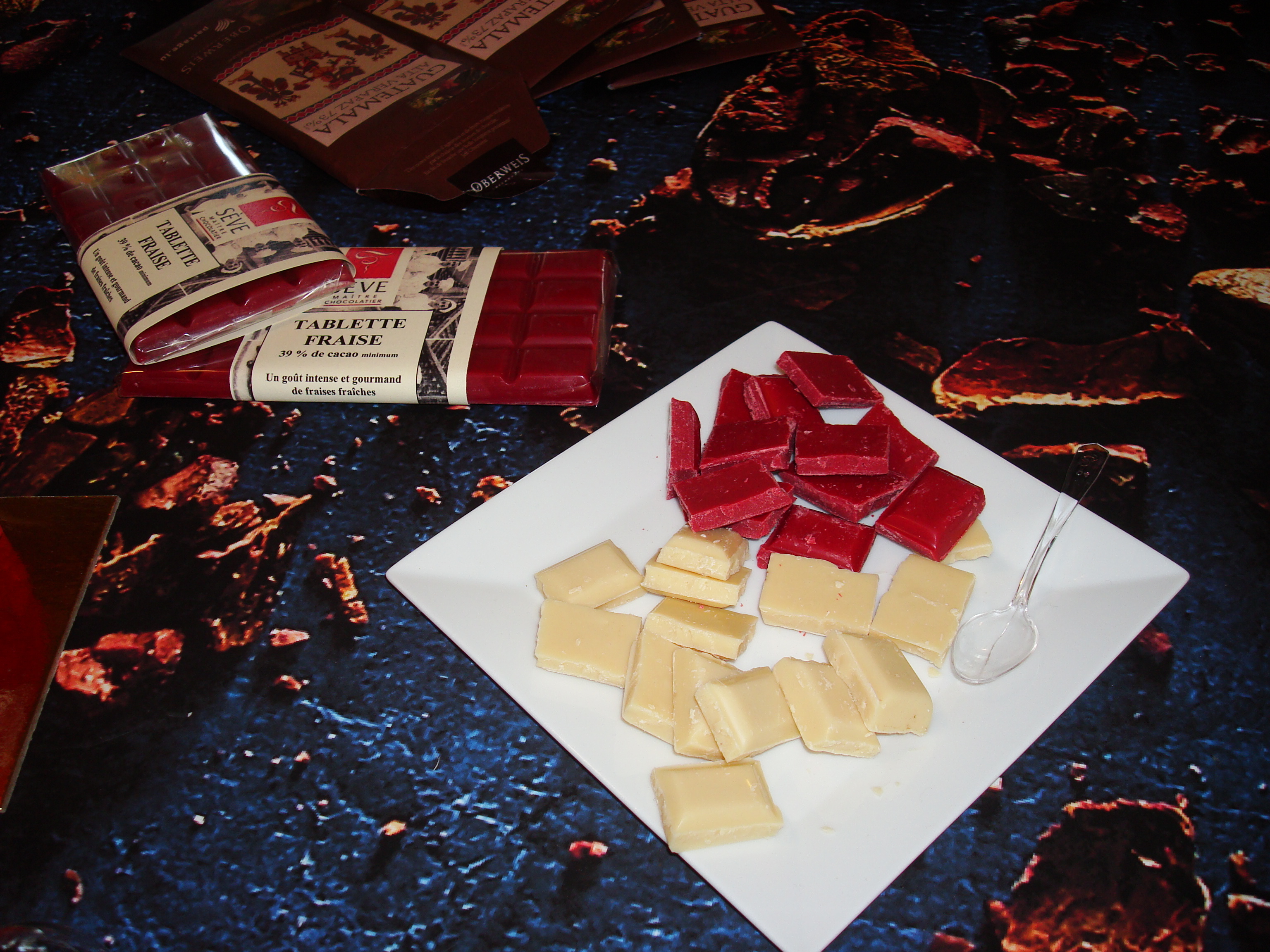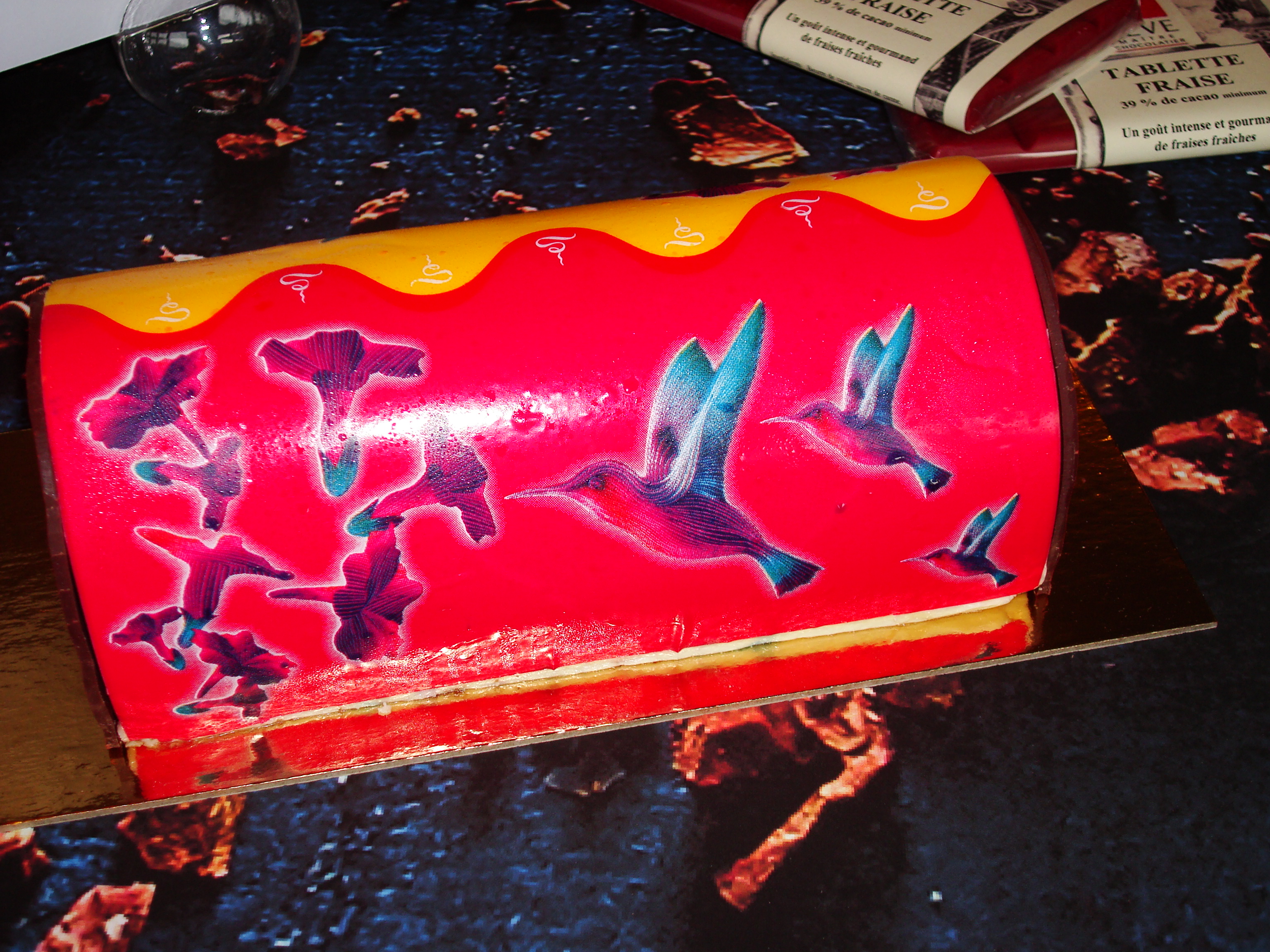 « Colibris » de Richard Sève – Compotée de mangue passion, ganache montée à la fraise, biscuit. Cette bûche très colorée met à l’honneur l’innovation de la maison Sève : un chocolat à la fraise, fabriqué avec des fraises séchées ! Les tablettes de chocolat à la fraise, ainsi que celles au chocolat au citron sont en vente dans la boutique Sève à Lyon. Ces nouveaux chocolats très parfumés offrent de nombreuses possibilités en pâtisserie : le chocolat blanc aux fruits permet de réaliser une ganache montée sans devoir ajouter de la gélatine !