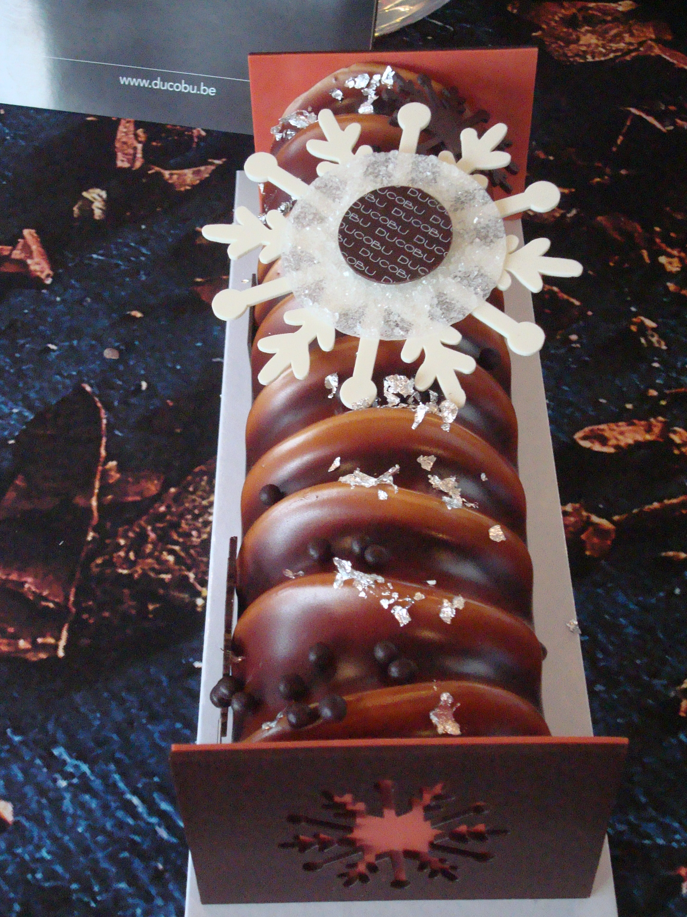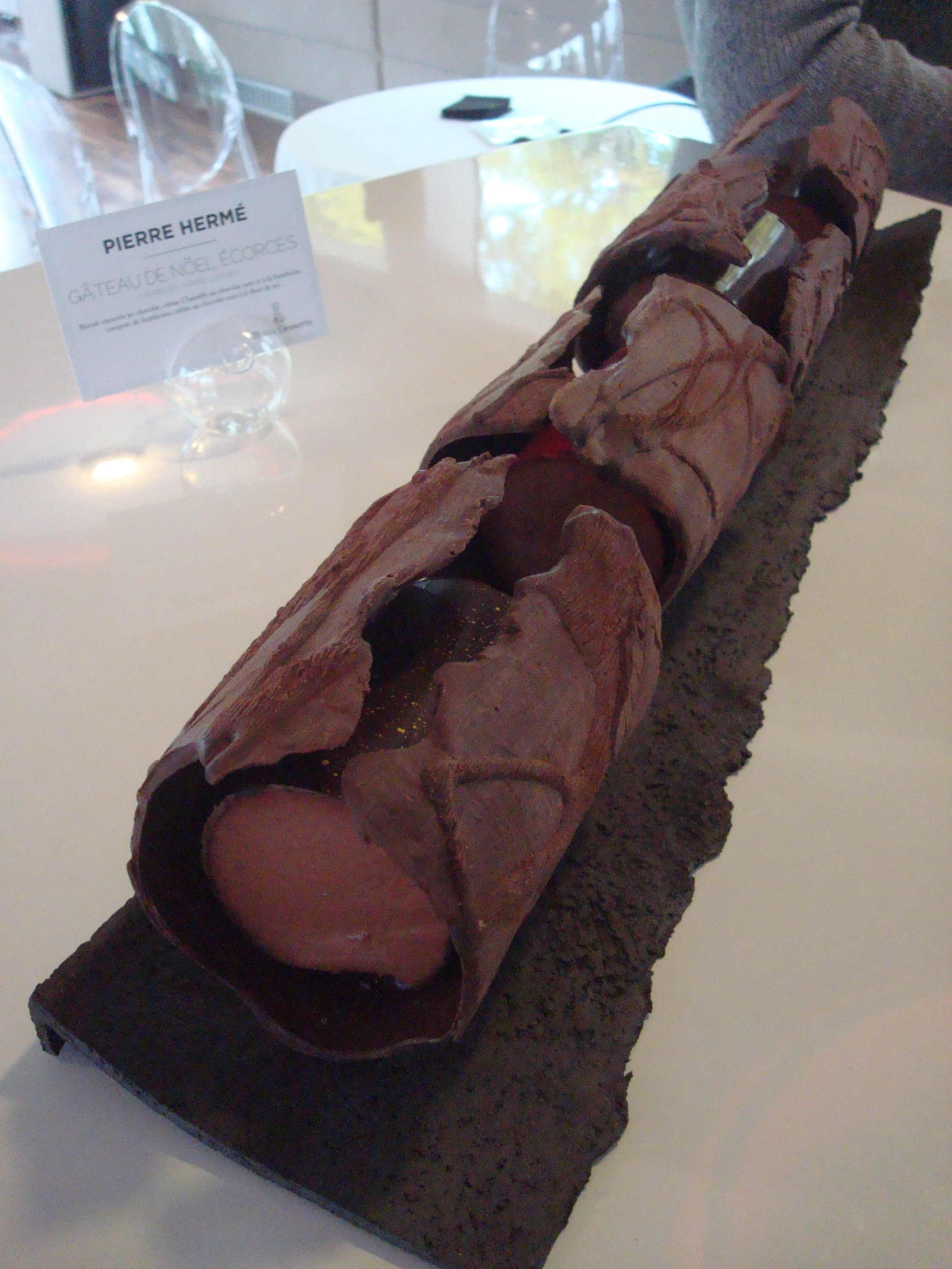 « Gâteau de Noël écorces » de Pierre Hermé – Biscuit viennois au chocolat, crème chantilly au chocolat noir et à la framboise, compote de framboises, sablés au chocolat noir et à la fleur de sel.