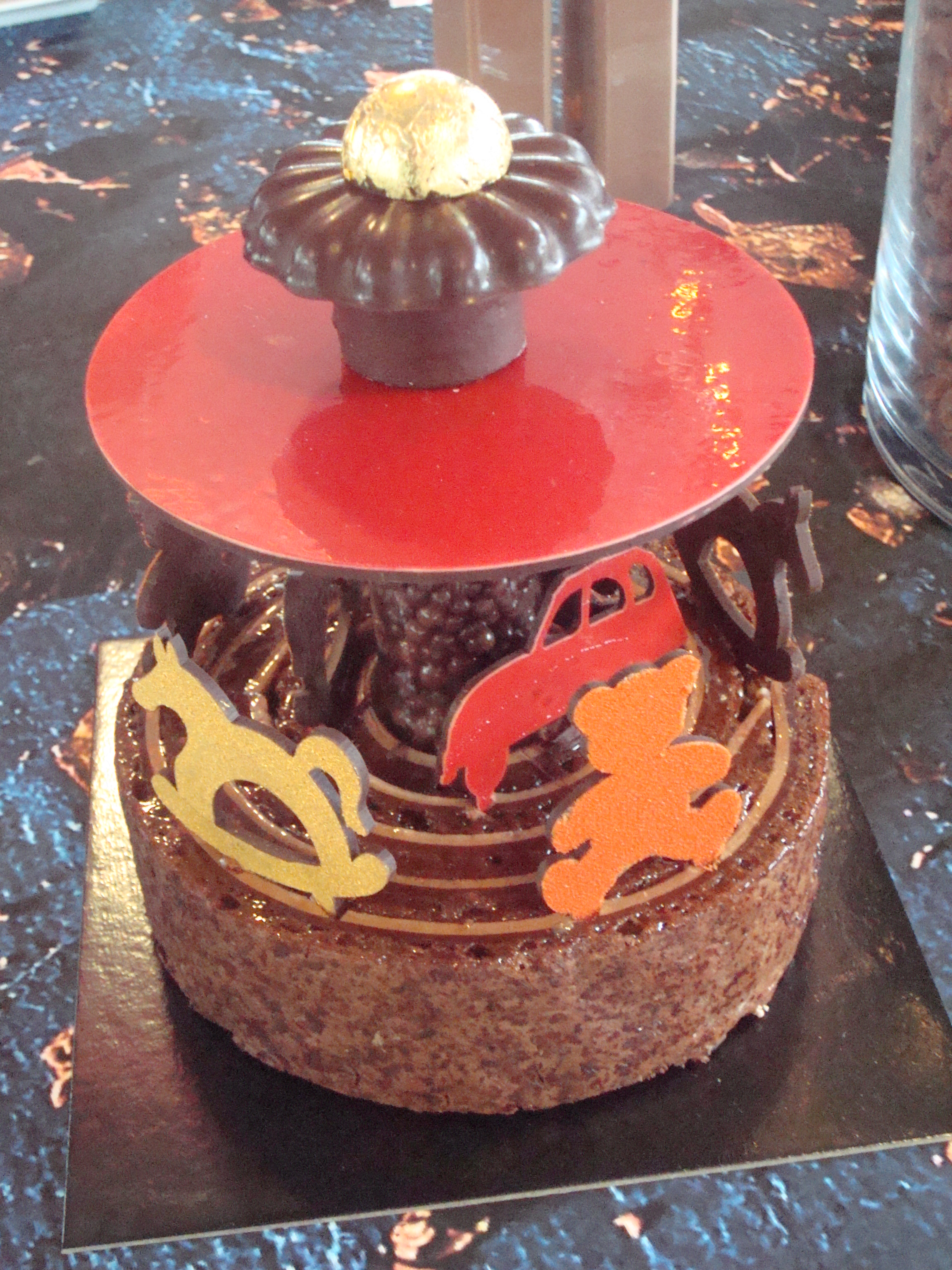 « Carrousel » de Vianney Bellanger – Biscuit roulade cacao, croustillant cacao, crémeux au cacao, mousse au chocolat. Le moelleux du biscuit au bon goût de chocolat est contrebalancé par le croquant du streusel, et grâce à la fraîcheur de la ganache au chocolat, ce dessert n’est pas sec du tout. C’est une bûche aux saveurs « doudou », en adéquation avec sa décoration enfantine.