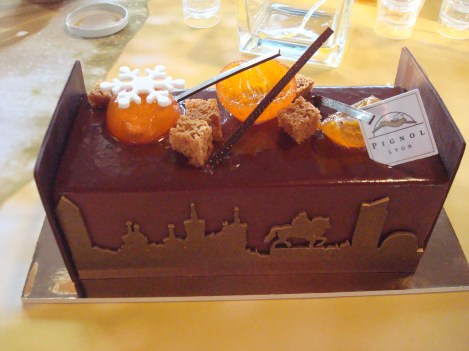 « Bellecour » de Jean-Paul Pignol – Biscuit moelleux aux épices, confit de clémentines, croquant de fruits secs et mousse au chocolat.