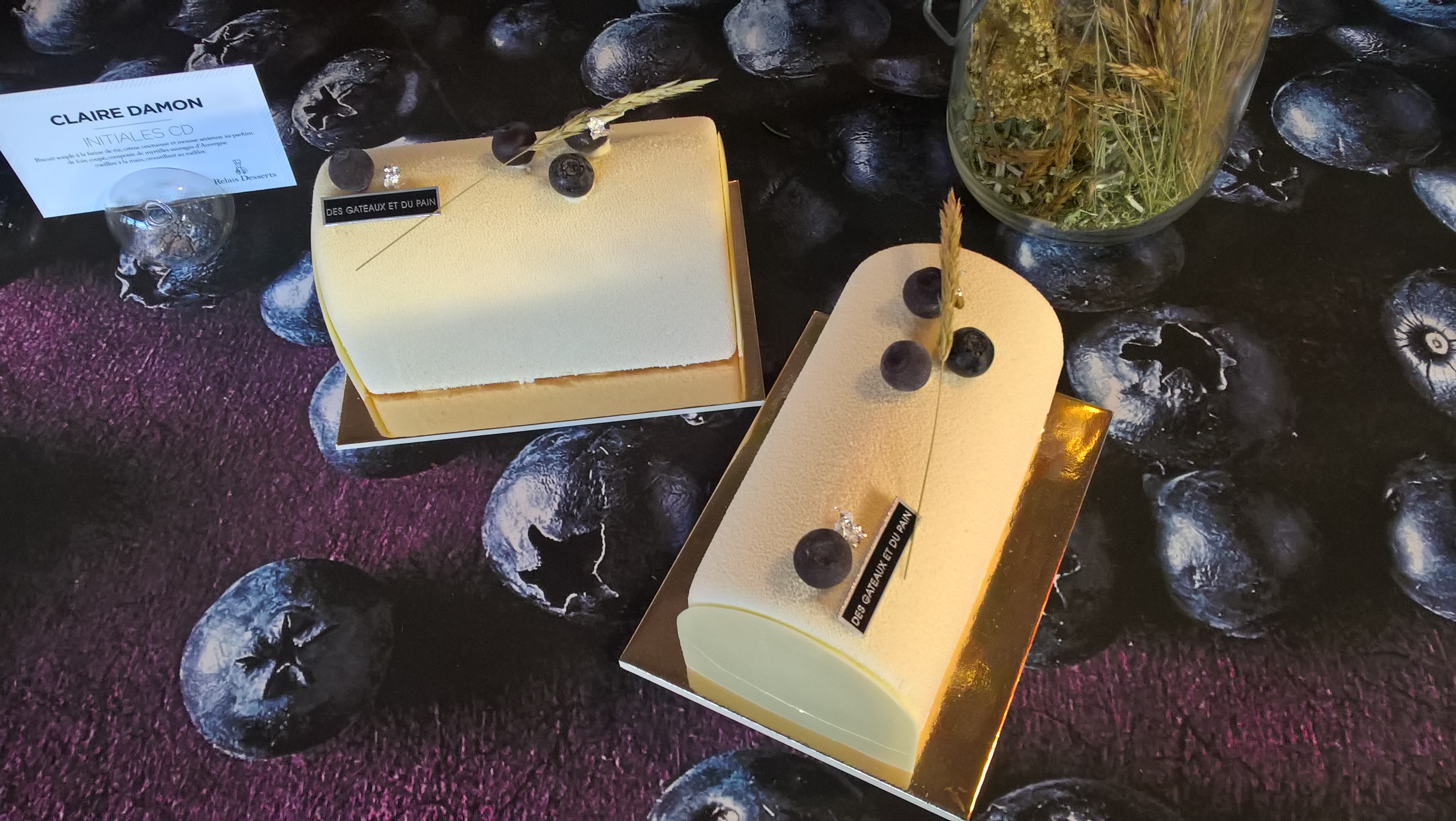 « Initiales CD » de Claire Damon – Biscuit à la farine de riz, mousse aérienne au foin coupé, compotée de myrtilles sauvages et croustillant au mélilot. Cette bûche est directement inspirée par le dessert emblématique de la pâtissière, la tartelette aux myrtilles au foin coupé.