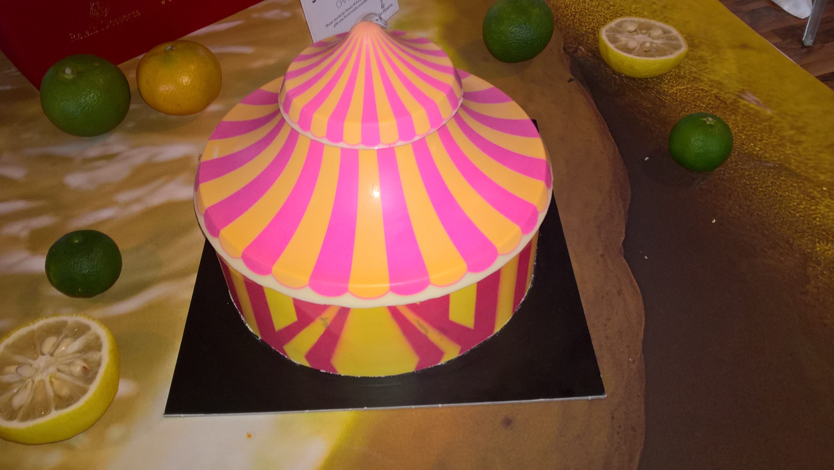 « Chapiteau » de Sébastien Bouillet – Mousse au chocolat au lait à la noisette, crémeux yuzu, gelée yuzu, biscuit noisette et croustillant pop-corn.