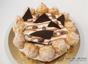 Entremets Caramélia – Crémeux aux agrumes, mousse au chocolat au lait et au caramel, mousse à la vanille et biscuit madeleine