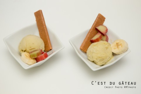 J’ai vraiment adoré la confiture rhubarbe banane vanille que j’ai faite récemment ! Au point de la manger à la petite cuillère, c’est pour dire ! Puis j’ai découvert la recette de sorbet à la rhubarbe sur le blog Empreinte sucrée, et je me suis dit que je pourrais peut-être essayer de faire un sorbet avec les mêmes ingrédients. Pari réussi ! Les saveurs étaient bien là, la glace était onctueuse à souhait, et mes goûteurs en ont redemandé !